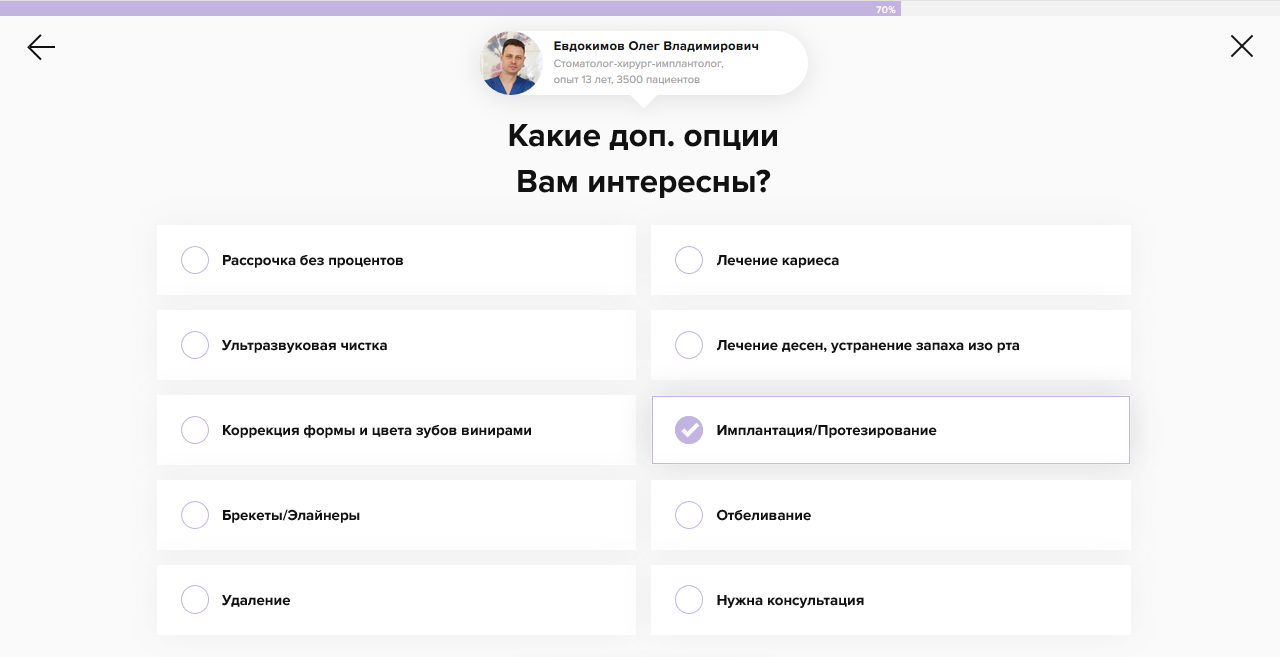 | | | | Применив рекомендации, увеличили количество обращений и установленных имплантов до 10-20 в месяц | | | | С 1 марта подключили опросник на остальные направления, теперь он отображается на всех страницах сайта